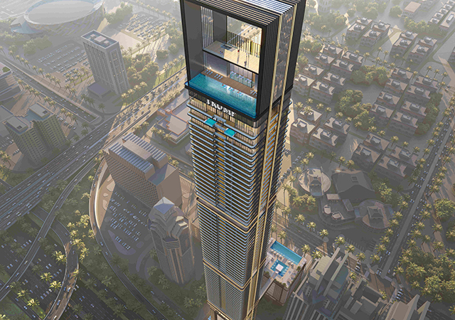 The 80-floor tower will stand 350-m tall featuring Dubai’s highest outdoor pool, two ultra-rare penthouses inspired by New York’s Trump Tower on Fifth Avenue and sweeping panoramic views of Burj Khalifa.