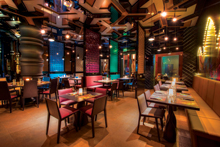 The indoor shisha room can accommodate up to 70 guests, while the shisha-free main dining room holds seating for 65. There is also outdoor seating for 80 on a large patio overlooking the Citywalk’s water fountains. Additional fire towers dot the patio with a warm glow.